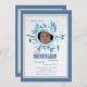 A chic, watercolor, winter invitation featuring frosted pine branches and cones in shades of blue. The round photo window is framed and ready to hold your child's photo.