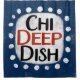 A fun and cute typographic message design that says "Chi Deep Dish". It has black and red text on a white rectangle with funky, playful white dots surrounding it, all on a blue background.