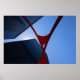 Take home a Chicago icon! Looking up from below, sleek modern Chicago skyscrapers are framed by a bold, red steel abstract structure against a clear blue sky. The contrasting elements create a striking, upward perspective.