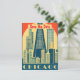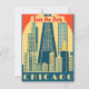 This Chicago invitation features a dramatic city silhouette against a radiant golden sun, perfect for an elegant city wedding. With its classic tourism art style and wanderlust vibes, it serves as a stunning keepsake for your guests.
