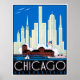 A vintage skyline of Chicago on a restored reproduction poster. Stylized buildings in the background and American flag waving over Fort Dearborn. Imaginary planes overhead.