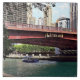 Colorful image of a Chicago Water Taxi travelling under the Columbus Drive Bridge.