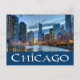 This fun travel postcard features an image of the beautiful Chicago skyline at Sunset with the lights dancing on the Chicago river. Chicago is nicknamed the "windy city" and is the third largest city in the United States.