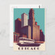Chicago poster. Tram in front of the recognizable city buildings. Travel poster