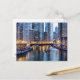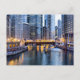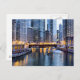 As twilight descends, the lights on the streets and in buildings reflect in the deep blue of the Chicago River