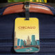 Retro Chicago Illinois travel poster illustration that features a a view of the Chicago River as a boat travels down the waterway with the Windy City's skyline in the background. This vintage design will bring back memories of classic travel posters from a bygone era.