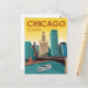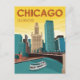 Retro Chicago Illinois travel poster illustration that features a a view of the Chicago River as a boat travels down the waterway with the Windy City's skyline in the background. This vintage design will bring back memories of classic travel posters from a bygone era.