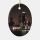 View of the Chicago Skyline with the John Hancock Building lit up at night from the end of Navy Pier