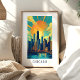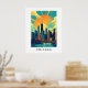 Stylized poster of Chicago’s skyline at sunset with bold sunlight beams, deep shadows, and vivid colors reflecting over the water.