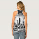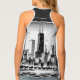 Fun and modern tank top featuring the Chicago (Illinois) skyline and landscape. Chicago graphic is on the back of the tank. The front is solid black with typography you can customize. Black and white colors. Featured on the front is, "CHICAGO." Change the text or keep as-is. Use the template to create your own Chicago tank top.