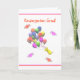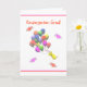 A childrens kindergarten or preschool graduation card with my image of a cute little chicken holding a bunch of colorful balloons with graduation caps.
