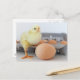 Here's a cute, close up color photograph showing a very young, newly hatched, fluffy yellow chick standing next to a nice brown egg. Behind the bird is a cardboard carton full of more eggs. Perfect for hatcheries or farmers that incubate and hatch their own poultry for meat or eggs.