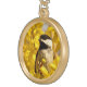 Here is a floral necklace featuring an adorable black and white chickadee among gold and yellow forsythia flowers. This sweet little bird is one of the friendliest creatures in the animal kingdom. A great idea for gardeners or birders!