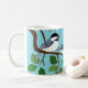 Pair of Black capped chickadees on a leafy tree branch and blue background