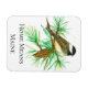 A "Home Means Maine" magnet decorated with a black capped chickadee bird perched on a white pine cone tassel branch illustrated with sepia ink and watercolor. Inspired by the state bird and state flower of Maine. You can edit or remove the text to fit your needs.