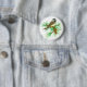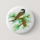 A button pin decorated with a black capped chickadee bird perched on a white pine cone tassel branch illustrated with sepia ink and watercolor. Inspired by the state bird and state flower of Maine. You can add text to fit your needs.