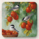 Birds in the apple orchard during the autumn harvest. Two black-capped chickadees perch in an apple tree while a third chickadee sits on a basket filled with ripe, freshly harvested fruit ready for market. Realistic artwork created from an original oil painting by wildlife artist Crista S. Forest.