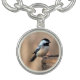 This charm bracelet features a Black-capped Chickadee (Poecile atricapillus) with black and white feathers and a rust colored belly perched on the edge of a wooden feeder, bathed in the golden orange light of sunset.