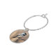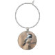 Identify your wine glass with this wine charm which features a Black-capped Chickadee (Poecile atricapillus) perched on the edge of a wooden feeder, bathed in the golden orange light of sunset.