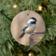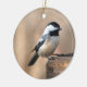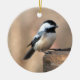 This holiday ornament features a tiny chickadee perched on the edge of a bird feeder. His innocence is bathed in a golden light. Won't he be lovely hanging from your Christmas tree?