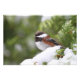 Photo of a chickadee in snow on a cedar tree branch. A mound of snow is covering the green cedar branches and the chestnut backed chickadee is sitting in profile. This nature photograph of a bird in winter can be customized and printed on many different products.