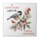 On this tile, a little black and tan chickadee bird perches on a winter branch with red berries. The red and black text above and below the image says "A HAPPY HOME is filled with LOVE & LAUGHTER". Everything is placed on a white background. Perfect for the Holiday season, but suitable for all year, too.