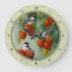 Birds in the apple orchard during the autumn harvest. Two black-capped chickadees perch in an apple tree while a third chickadee sits on a basket filled with ripe, freshly harvested fruit ready for market. All on a cheerful green patterned background. Realistic artwork created from an original oil painting by wildlife artist Crista S. Forest.