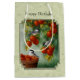 Birds in the apple orchard during the autumn harvest. Two black-capped chickadees perch in an apple tree while a third chickadee sits on a basket filled with ripe, freshly harvested fruit ready for market. All on a cheerful green patterned background. Realistic artwork created from an original oil painting by wildlife artist Crista S. Forest.
