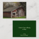 This scenic fine art artist trading card features a rural country scene with an old wood chicken coop with weathered red wooden barn board and white trim around the window set on a lovely green lawn and an evergreen tree behind. The apple tree with white and pink flowers tells us it is spring.