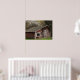 This scenic fine art poster features a rural country scene with an old wood chicken coop with weathered red wooden barn board and white trim around the window set on a lovely green lawn and an evergreen tree behind. The apple tree with white and pink flowers tells us it is spring.