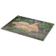 This cutting board features a buff orpington hen sunning herself in the herb garden