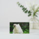 Color photograph of a young white chicken surrounded by lush green vegetation. The perfect choice for the farmer that sells hatching eggs, chicks, or pullets for meat or eggs. Both sides are customizeable with your own text. Another version is available with the hen facing the text fields here