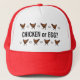 What came first, the chicken, or the egg? This design doesn't answer the question, but it's fun to look at! Brown hens and white chicken eggs endlessly follow each other in rows across this illustration beneath the text “chicken or egg?” You can even change the text if you'd like. Makes a great gift for poultry farmers, bird lovers or anyone looking for a bold and funny hat.