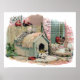 "Toby barks quite fierce, But none care a pin, The cat on the top of his house sits and blinks, The hen says no danger, At least so she thinks." A hen and her chicks are on the stoop next to an old straw broom. A rooster and another hen are roosting on the wall. A white cat sits on some cloth that has been thrown on top of a doghouse to which a small dog is tied in this antique illustration from an 1899 children's book.