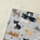 Cute chihuahua dogs with black, brown, tan, cream, gray and blue coats sit and stand scattered dog bones and paw prints on a light gray background.