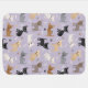 Cute chihuahua dogs in black, brown, tan, cream, gray and blue coats sit and stand scattered dog bones and paw prints on a light purple background.