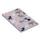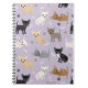 Cute chihuahua dogs in black, brown, tan, cream, gray and blue coats sit and stand scattered dog bones and paw prints on a light purple background.