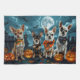 Unleash the spooky spirit with this eerie Halloween design featuring a pack of dogs under a dark, moonlit sky, surrounded by flying bats and glowing pumpkins. Perfect for those who love a touch of frightful fun with their furry friends!