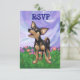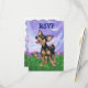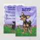 Animal Parade Playful Chihuahua Dog RSVP Customizable Kids Birthday RSVP Card brought to you by Imagine That! Design features our cute black and tan Chihuahua standing on a grassy yard with a beautiful blue and purple etxtured sky and a playful wavy purple border. You’ll find this fun heads and tails canine painted by our talented children’s illustrator, Traci Van Wagoner, on coordinating invitations, cards, party favors and much more. Much of our fun party gear shows both sides of the cute Chihuahua, head and butt, in colorful, fun art that will bring a smile to the face of any animal lover, Chihuahua lover, or small dog lover. Anyone who loves dogs will be delighted to use this playful pup for their fun animal themed party. On the invitation, you’ll find the funny pup coming and going with this fun artwork of the dog's head on the front and the funny Chihuahua’s tail on the back with all the customizable party information. Party on with this adorable black and tan dog! Woof!