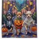 Adorable Chihuahuas dressed in playful Halloween costumes carry pumpkin buckets while trick-or-treating under the moonlit sky. This festive design highlights the breed’s tiny size, big personality, and lively spirit, perfectly capturing the spooky yet fun atmosphere of Halloween night. A charming celebration for dog lovers and Halloween fans alike.