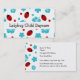 Daycare business card template in bright and fun design including cute ladybugs, flowers, and hibiscus flowers in turquoise, Red, and wbite. Highlights your company name on the front and displays your daycare details on the flip side. Designed as a daycare or babysitting design.