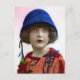 Beautiful vintage French hand-colored photograph of a lovely little girl wearing a bright blue hat.