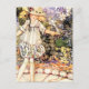Illustration by Anne Anderson for a Mother Goose rhyme "Mary, Mary Quite Contrary". Blond haired girl with straw hat walking in her beautiful garden