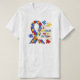 A puzzle piece that reads 'I Love a Child With Autism", puzzle pieces of blue, red, and yellow and the autism awareness ribbon on autism awareness T-shirts, hoodies, mugs, magnets, cards, stickers, bags, keychains, buttons, and other items.
