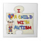 A big puzzle piece, a heart composed of puzzle pieces, a stick figure brunette haired girl, and text that reads "I Love a Child With Autism" on autism awareness T-shirts, mugs, cards, stickers, tote bags, magnets, keychains, journals, mousepads, and other apparel and gift items.