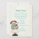 Cute children Easter party invitation, made with a cottage chic floral background, with an oval cut out for the text. Sweet country artwork of a Raggedy doll holding a big painted Easter egg and paint brush, decorates the bottom left of the invitation. Text is in aquamarine and is fully customizable to suit your party needs. Very sweet kid's party invitation.