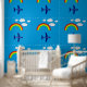 Colorful children's room wallpaper done in blue, with graphic of clouds, rainbows and a personalized airplane. Personalize the text field for your child's bed or bathroom. Great for use as a border or full wall.