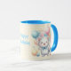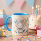 Ceramic mug with an adorable kitten design surrounded by balloons, perfect for gifting on birthdays or surprising someone special. Its interior and handle in a sky blue tone add a modern and delicate touch. Ideal for enjoying your favorite drink with a sweet and cheerful style.