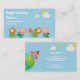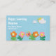 A Daycare Business Card with bright colored flowers, yellow stars and a butterfly on a blue front. Reverse is designed with a child's toy rocket ship and yellow stars, on a blue background. To personalize, simply insert your details into our easy template, replacing the sample text.