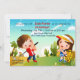 A vibrant, juvenile invitation just perfect for a golfing birthday celebration. The card features a boy swinging a golf club and a little girl with a golf bag on a golf course.